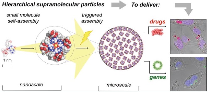 The figure above illustrates the hierarchical self-assembly process from molecular building blocks to microscale particles, as well as their application in drug and gene delivery.