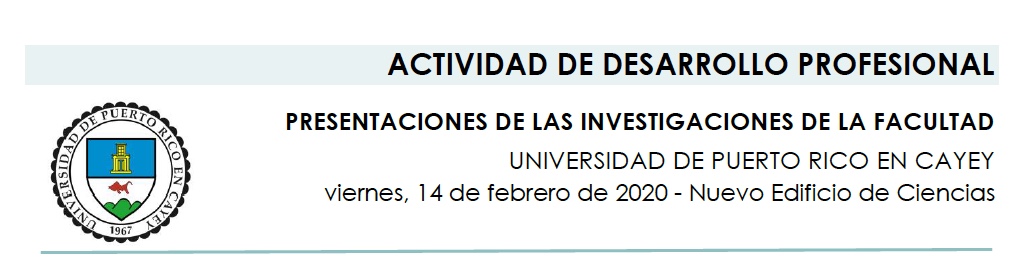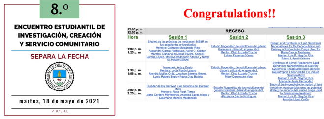 Our research students will be presenting their projects at the 8th Student Meeting of Research, Creations, and Community service of the UPR Cayey Interdisciplinary Institute.