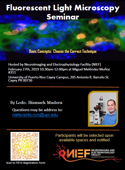 Lic. Bismark Madera from the Neuroimaging and Electrophysiology Facility (NIEF) will be offering a fluorescent light microscopy seminar at the University of Puerto Rico at Cayey. Don’t forget to register for this great opportunity!