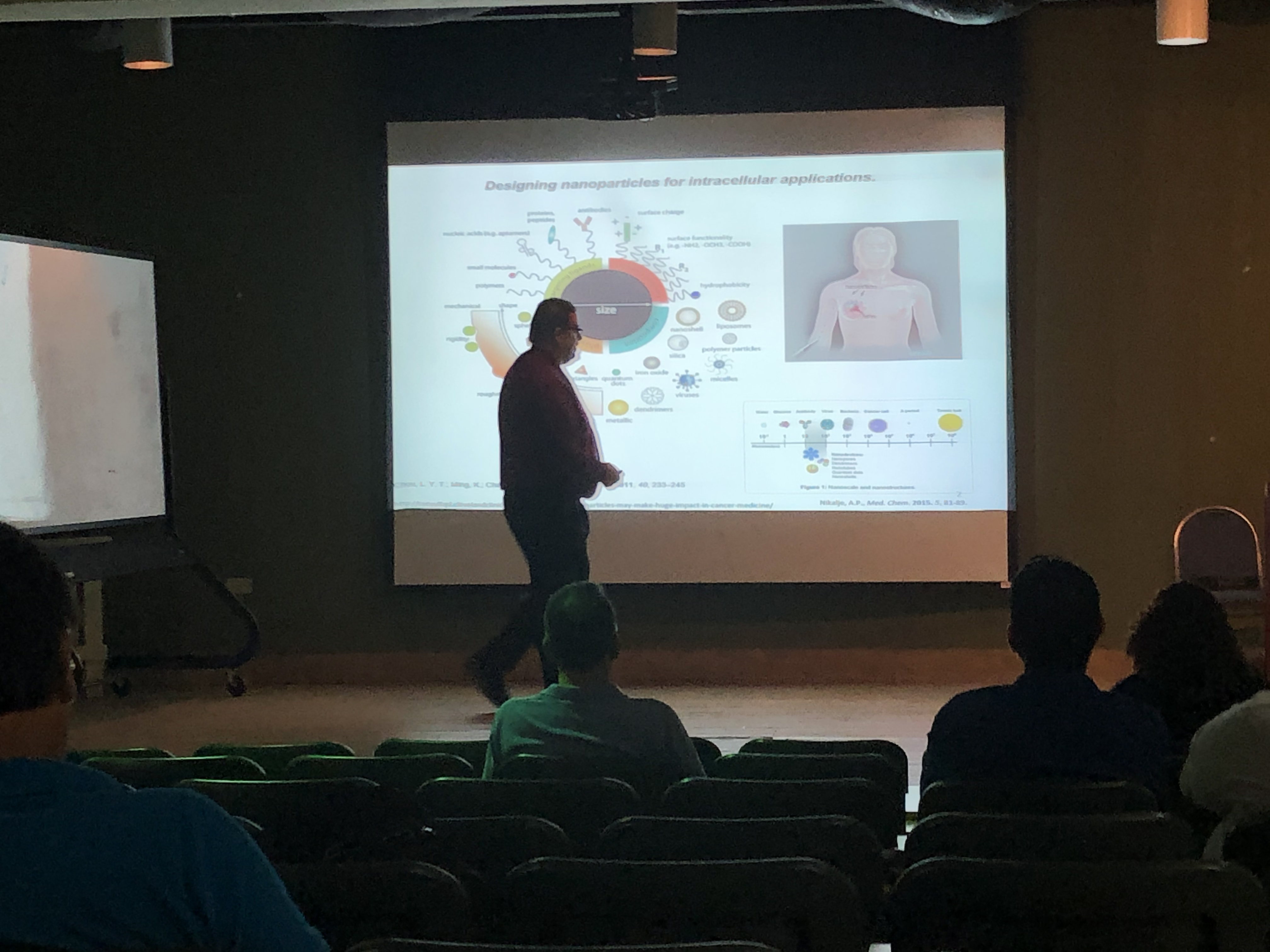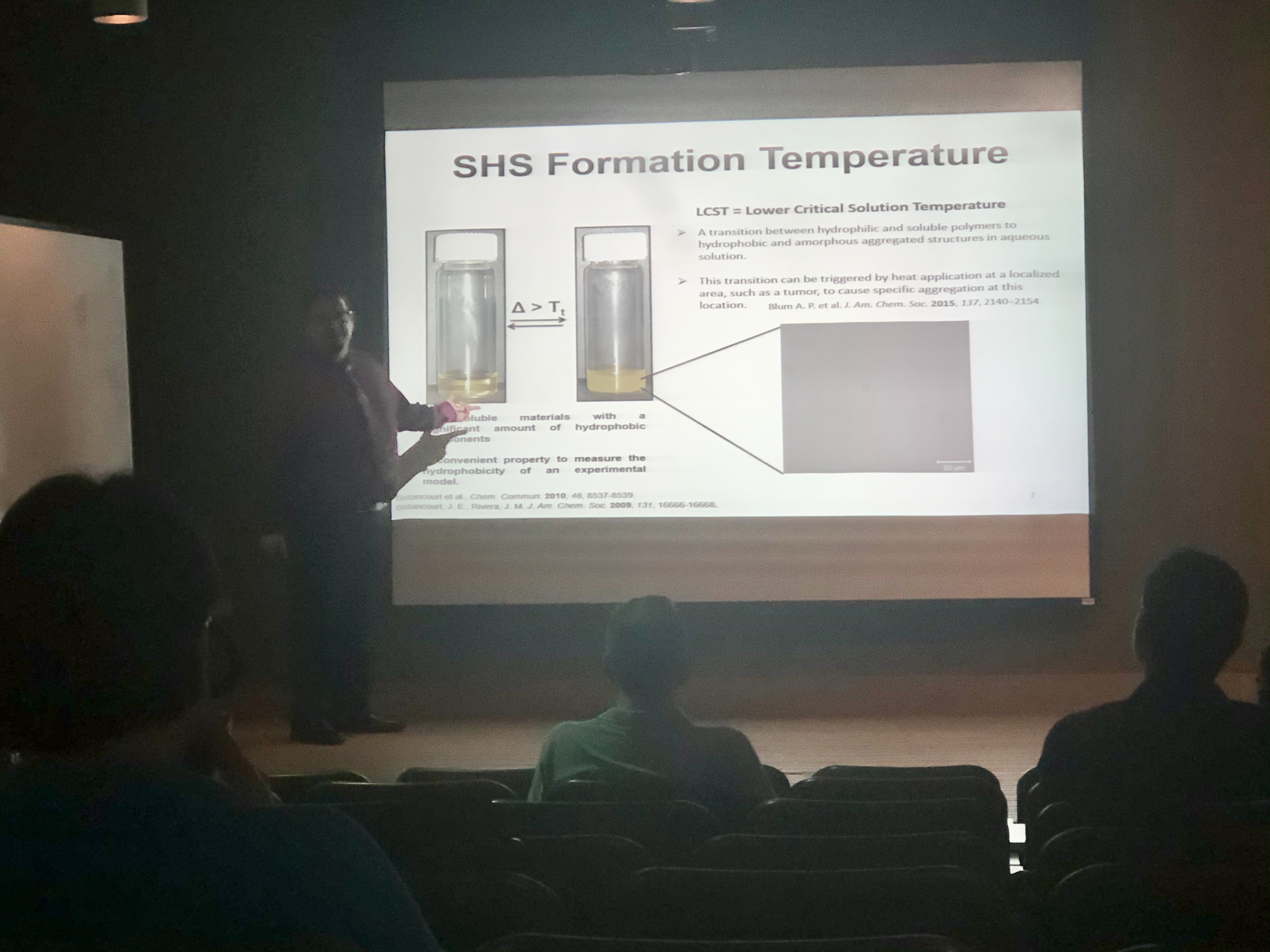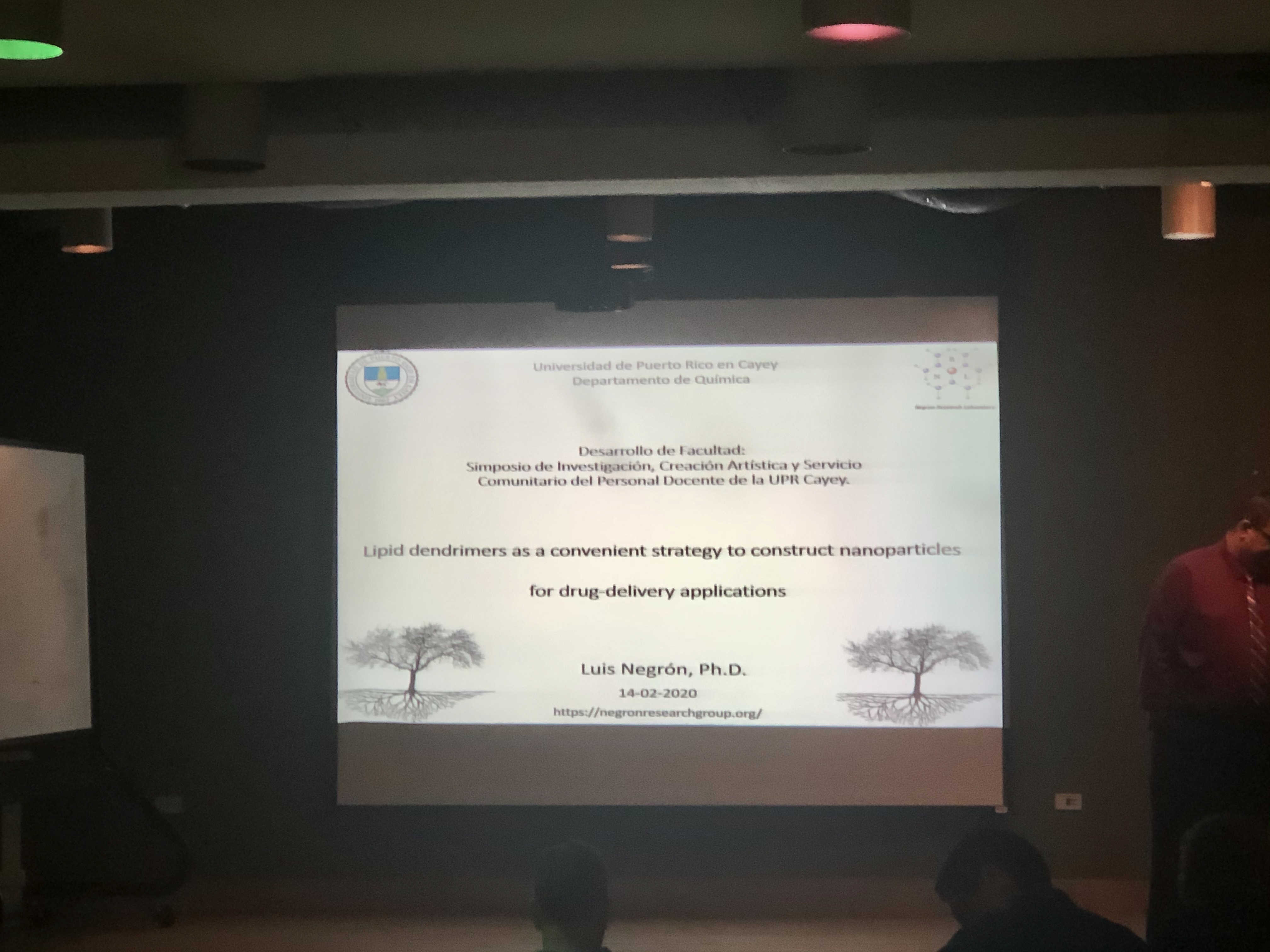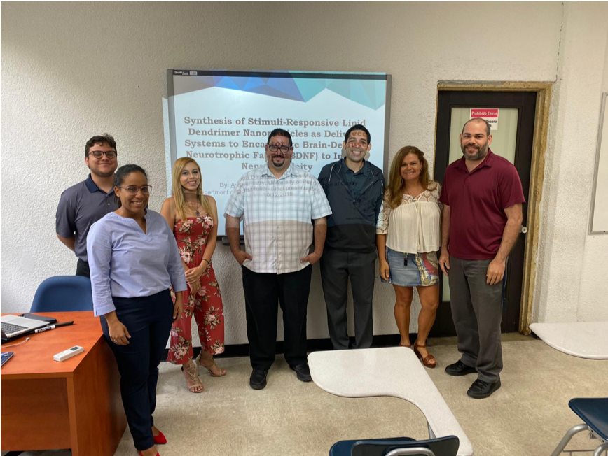 Dr. Negrón talked about his research. His interests are the synthesis and study of stimuli-responsive organic molecules called lipid dendrimers that self-assemble in nanoparticles for drug-delivery applications. He is interested in understanding how lipid dendrimers can form these nanoparticles in order to develop a new alternative for therapeutic agents for neurological applications.