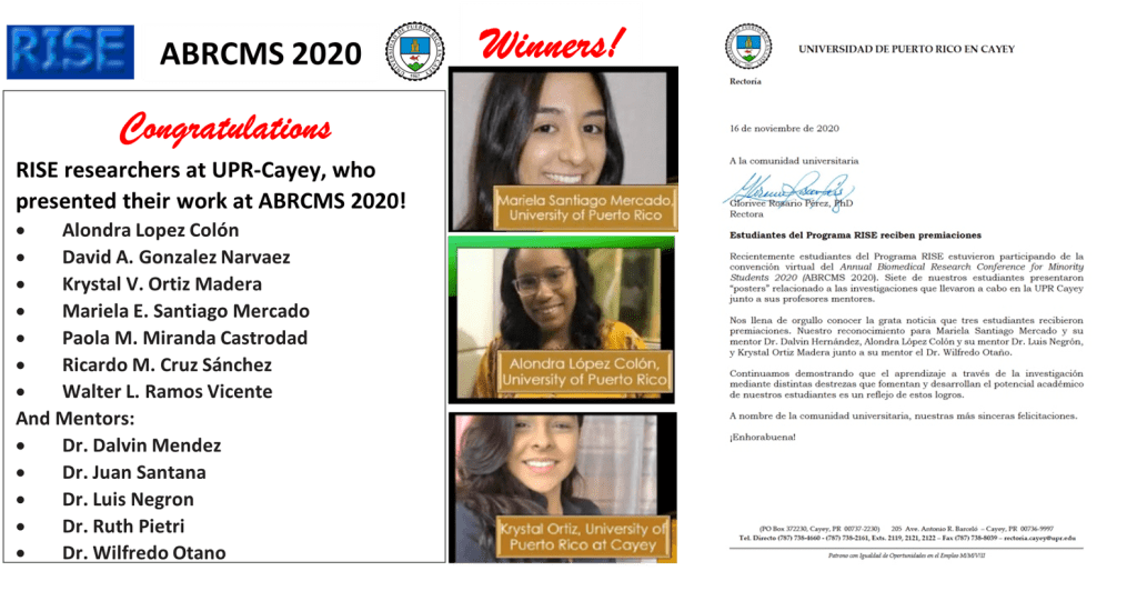 Congratulations Alondra, Mariela and the students from UPR Cayey on their ABRCMS 2020 Presentations!! Alondra and Mariela WON Outstanding Presentation Awards!!!