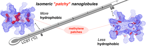 We describe precise supramolecules that enable the evaluation of the effective hydrophobicity of amphiphilic or “patchy” nanoglobular systems. These supramolecules exhibit the lower critical solution temperature phenomenon, which provides a quantitative measure of their effective hydrophobicity. Specifically, two isomeric 8-aryl-2′-deoxyguanosine derivatives with a transposed pair of methylene groups self-assemble into hexadecameric nanoglobular supramolecular G-quadruplexes (SGQs) that show large differences in their transition temperatures as determined by turbidity and differential scanning calorimetry studies. Molecular modeling studies suggested that differential clustering of the hydrophobic patches on the surface is responsible for the striking differences between the two isomeric supramolecules.